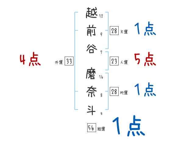 外運![]() | 越前谷磨奈斗さんの外運は33画の4つ星!権力志向でプライドが高い。勇気があり運を切り開き成功する。 生活面を象徴する運勢です。外部から受ける影響力を表し、結婚運、家庭運や職場、環境への順応性を表します。 |
