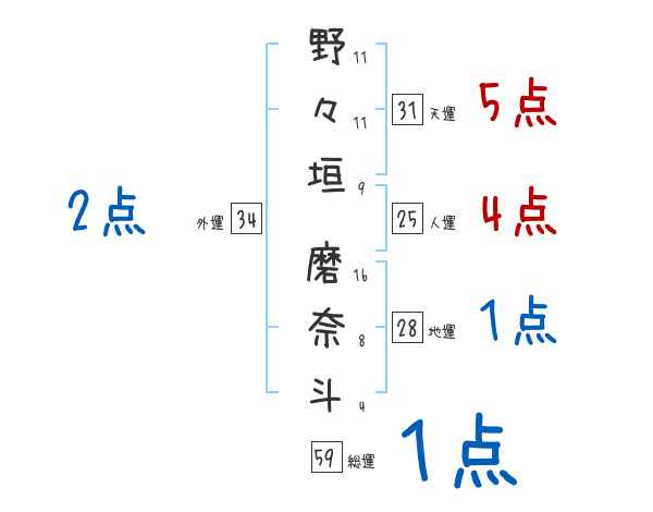外運![]() | 野々垣磨奈斗さんの外運は34画の2つ星!独創性に優れるが、自尊心が強く災難に注意しましょう。 生活面を象徴する運勢です。外部から受ける影響力を表し、結婚運、家庭運や職場、環境への順応性を表します。 |