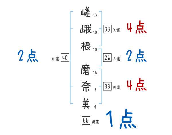 天運![]() | 嵯峨根磨奈美さんの天運は33画の4つ星!権力志向でプライドが高い。勇気があり運を切り開き成功する。 家系が持つ宿命的な運勢を表します。祖先から受け継いだ苗字ですので自分の力が及びません。家柄を象徴します。 |