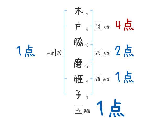 天運![]() | 木戸脇磨姫子さんの天運は18画の4つ星!情熱的で剛気。忍耐力があり信頼される。 家系が持つ宿命的な運勢を表します。祖先から受け継いだ苗字ですので自分の力が及びません。家柄を象徴します。 |