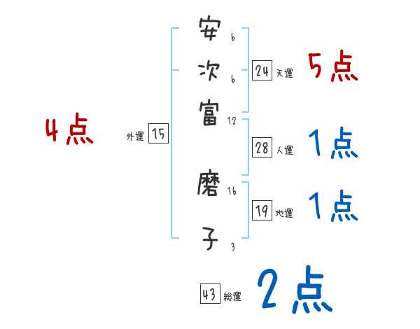 天運![]() | 安次富磨子さんの天運は24画の5つ星!家庭運が良く順調な人生。金運にも恵まれる。 家系が持つ宿命的な運勢を表します。祖先から受け継いだ苗字ですので自分の力が及びません。家柄を象徴します。 |