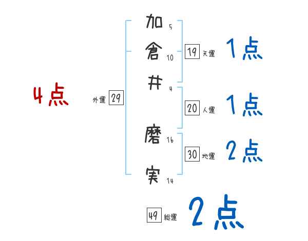 外運![]() | 加倉井磨実さんの外運は29画の4つ星!完全主義で才能がある。厳格な心の持ち主。 生活面を象徴する運勢です。外部から受ける影響力を表し、結婚運、家庭運や職場、環境への順応性を表します。 |