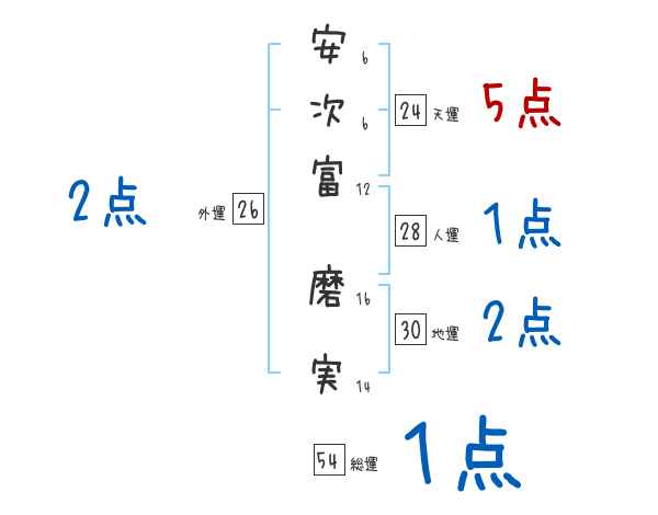 天運![]() | 安次富磨実さんの天運は24画の5つ星!家庭運が良く順調な人生。金運にも恵まれる。 家系が持つ宿命的な運勢を表します。祖先から受け継いだ苗字ですので自分の力が及びません。家柄を象徴します。 |
