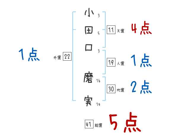 天運![]() | 小田口磨実さんの天運は11画の4つ星!着実に富や地位を得る幸運な人生。 家系が持つ宿命的な運勢を表します。祖先から受け継いだ苗字ですので自分の力が及びません。家柄を象徴します。 |