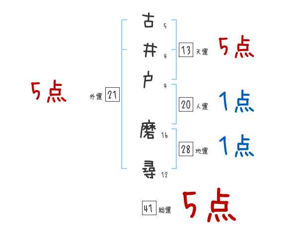 天運![]() | 古井戸磨尋さんの天運は13画の5つ星!才能に恵まれ人気がある。名声を手に入れる。円満な人生。 家系が持つ宿命的な運勢を表します。祖先から受け継いだ苗字ですので自分の力が及びません。家柄を象徴します。 |