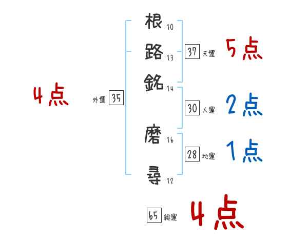 外運![]() | 根路銘磨尋さんの外運は35画の4つ星!温厚な性格で感受性が高い。穏和な性格で人望が厚い。 生活面を象徴する運勢です。外部から受ける影響力を表し、結婚運、家庭運や職場、環境への順応性を表します。 |