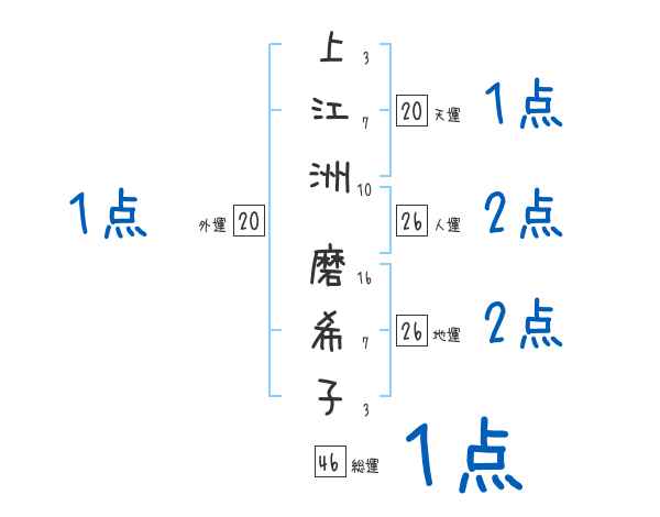 総運![]() | 上江洲磨希子さんの総運は46画の1つ星!迷走することが多く苦労するかも。目先のことにとらわれないように。 あなたの人生を表す1番重要な運勢です。生涯を通じて影響する総合運となり、主に50歳以降の晩年期に影響を及ぼします。 |
