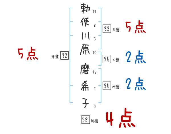 外運![]() | 勅使川原磨希子さんの外運は32画の5つ星!柔軟性があり成功する。チャンスが多く金運が良い。 生活面を象徴する運勢です。外部から受ける影響力を表し、結婚運、家庭運や職場、環境への順応性を表します。 |