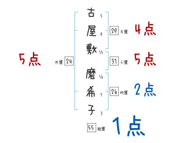 外運![]() | 古屋敷磨希子さんの外運は24画の5つ星!家庭運が良く順調な人生。金運にも恵まれる。 生活面を象徴する運勢です。外部から受ける影響力を表し、結婚運、家庭運や職場、環境への順応性を表します。 |