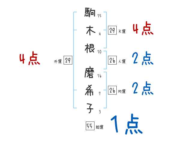 天運![]() | 駒木根磨希子さんの天運は29画の4つ星!完全主義で才能がある。厳格な心の持ち主。 家系が持つ宿命的な運勢を表します。祖先から受け継いだ苗字ですので自分の力が及びません。家柄を象徴します。 |