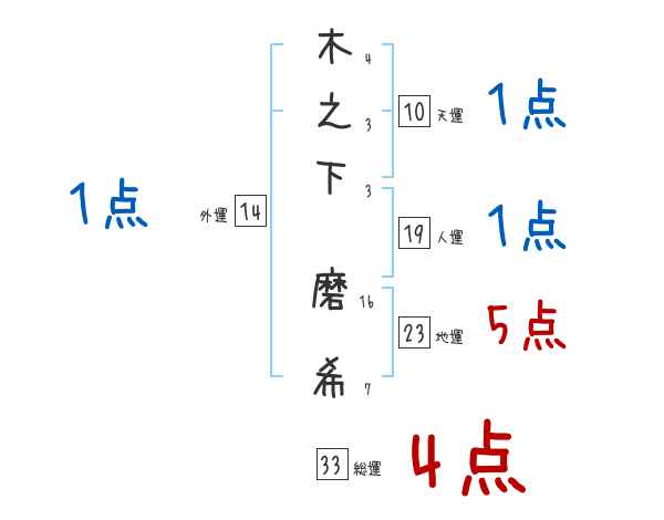 外運![]() | 木之下磨希さんの外運は14画の1つ星!人に対して優しいがストレスを溜め込みがち。人間関係のトラブルを避けるよう気をつけましょう。 生活面を象徴する運勢です。外部から受ける影響力を表し、結婚運、家庭運や職場、環境への順応性を表します。 |