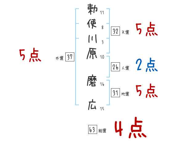 天運![]() | 勅使川原磨広さんの天運は32画の5つ星!柔軟性があり成功する。チャンスが多く金運が良い。 家系が持つ宿命的な運勢を表します。祖先から受け継いだ苗字ですので自分の力が及びません。家柄を象徴します。 |