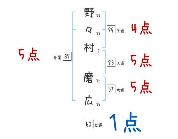 総運![]() | 野々村磨広さんの総運は60画の1つ星!悲観的で迷いやすい。波乱が多く損をしないように。 あなたの人生を表す1番重要な運勢です。生涯を通じて影響する総合運となり、主に50歳以降の晩年期に影響を及ぼします。 |