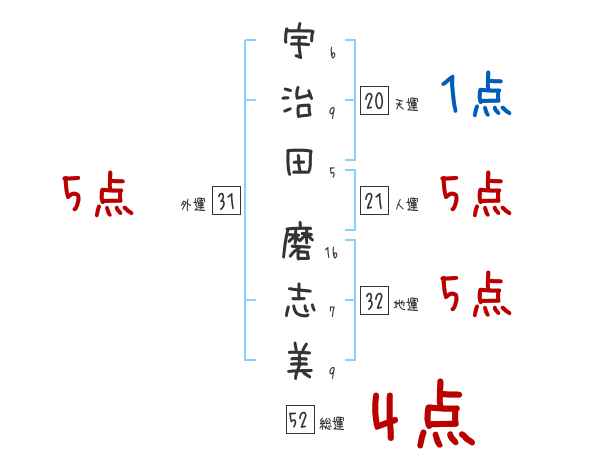 地運![]() | 宇治田磨志美さんの地運は32画の5つ星!柔軟性があり成功する。チャンスが多く金運が良い。 個性を表す基礎的な運勢です。性格形成や対人関係、行動力など家庭環境に影響されます。主に誕生してから20歳くらいまでの若年期の運勢を表します。 |
