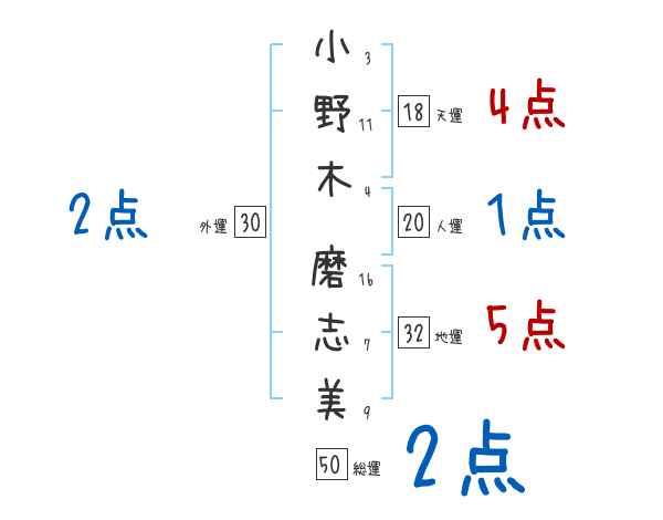 天運![]() | 小野木磨志美さんの天運は18画の4つ星!情熱的で剛気。忍耐力があり信頼される。 家系が持つ宿命的な運勢を表します。祖先から受け継いだ苗字ですので自分の力が及びません。家柄を象徴します。 |