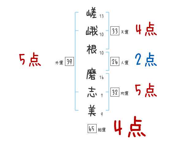地運![]() | 嵯峨根磨志美さんの地運は32画の5つ星!柔軟性があり成功する。チャンスが多く金運が良い。 個性を表す基礎的な運勢です。性格形成や対人関係、行動力など家庭環境に影響されます。主に誕生してから20歳くらいまでの若年期の運勢を表します。 |