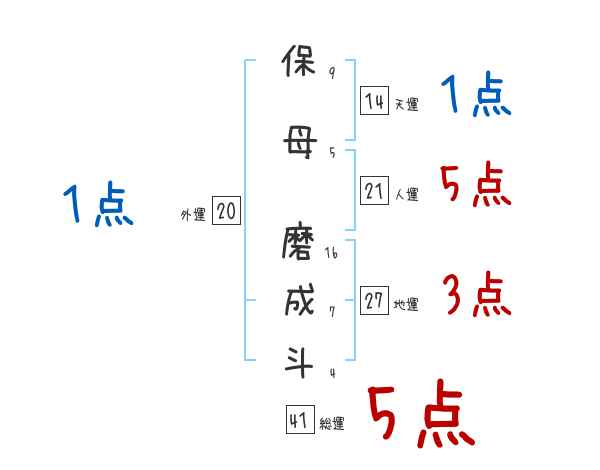 人運![]() | 保母磨成斗さんの人運は21画の5つ星!統率力がある。独立し成功する。名誉を手に入れる。 性格や才能などを表す2番目に重要な運勢です。人間関係や協調性、社会的な成功に影響します。主に20歳から50歳ぐらいまでの中年期の運勢を表します。 |