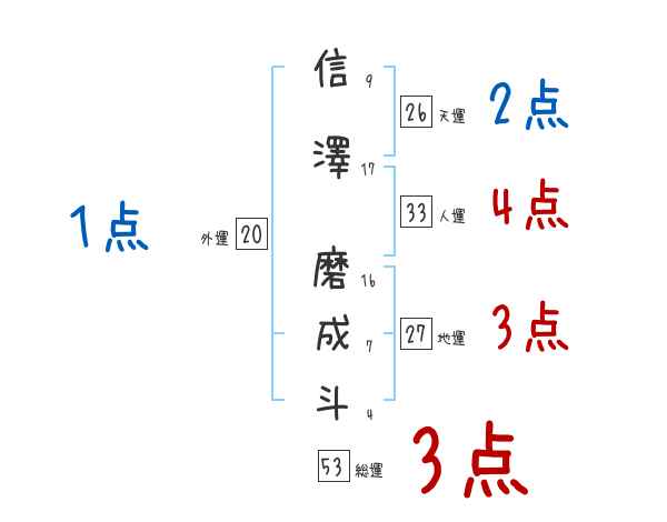 総運![]() | 信澤磨成斗さんの総運は53画の3つ星!やや見栄っ張りで虚栄心がある。散財に注意。 あなたの人生を表す1番重要な運勢です。生涯を通じて影響する総合運となり、主に50歳以降の晩年期に影響を及ぼします。 |