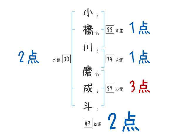 外運![]() | 小橋川磨成斗さんの外運は30画の2つ星!浮き沈みの激しさに注意しましょう。 生活面を象徴する運勢です。外部から受ける影響力を表し、結婚運、家庭運や職場、環境への順応性を表します。 |