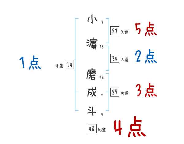 天運![]() | 小濵磨成斗さんの天運は21画の5つ星!統率力がある。独立し成功する。名誉を手に入れる。 家系が持つ宿命的な運勢を表します。祖先から受け継いだ苗字ですので自分の力が及びません。家柄を象徴します。 |