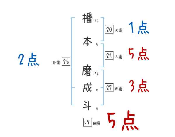 人運![]() | 播本磨成斗さんの人運は21画の5つ星!統率力がある。独立し成功する。名誉を手に入れる。 性格や才能などを表す2番目に重要な運勢です。人間関係や協調性、社会的な成功に影響します。主に20歳から50歳ぐらいまでの中年期の運勢を表します。 |