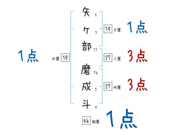 矢ヶ部磨成斗さんの外運は19画の1つ星