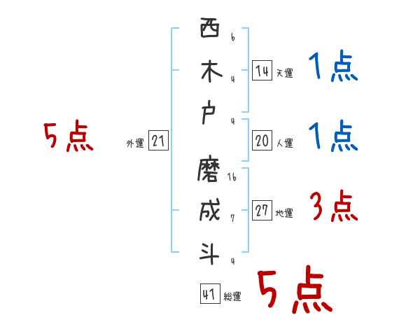 外運![]() | 西木戸磨成斗さんの外運は21画の5つ星!統率力がある。独立し成功する。名誉を手に入れる。 生活面を象徴する運勢です。外部から受ける影響力を表し、結婚運、家庭運や職場、環境への順応性を表します。 |
