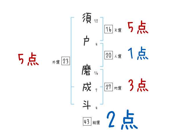 外運![]() | 須戸磨成斗さんの外運は23画の5つ星!想像力に優れ活力がある。一代で成功し名誉を手に入れる。 生活面を象徴する運勢です。外部から受ける影響力を表し、結婚運、家庭運や職場、環境への順応性を表します。 |