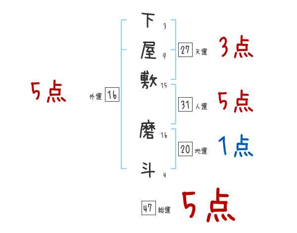 外運![]() | 下屋敷磨斗さんの外運は16画の5つ星!人望が厚く大きく発展する。逆転成功が見える。 生活面を象徴する運勢です。外部から受ける影響力を表し、結婚運、家庭運や職場、環境への順応性を表します。 |