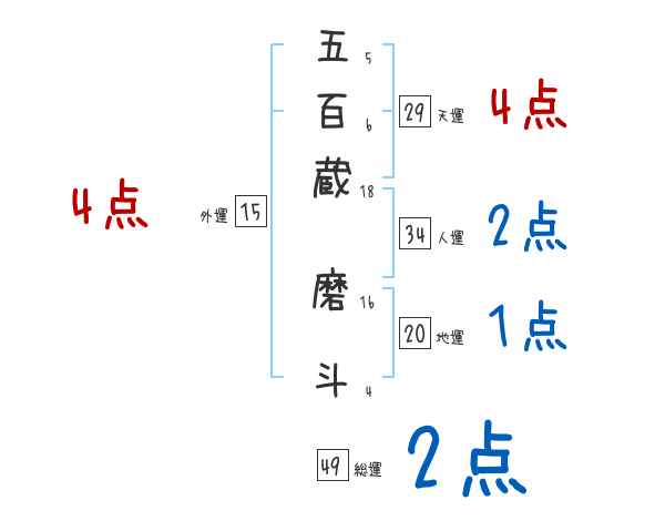 総運![]() | 五百蔵磨斗さんの総運は49画の2つ星!不安定な性格で明暗がある人生。周りの人には支援されやすい。 あなたの人生を表す1番重要な運勢です。生涯を通じて影響する総合運となり、主に50歳以降の晩年期に影響を及ぼします。 |