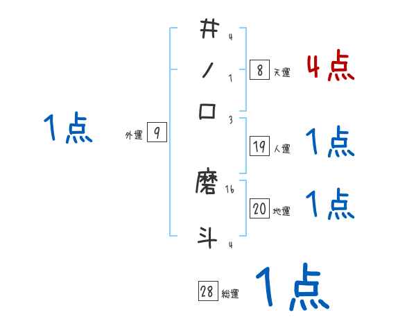 総運![]() | 井ノ口磨斗さんの総運は28画の1つ星!家庭環境に注意。スポーツで活躍できる能力があるかも。 あなたの人生を表す1番重要な運勢です。生涯を通じて影響する総合運となり、主に50歳以降の晩年期に影響を及ぼします。 |