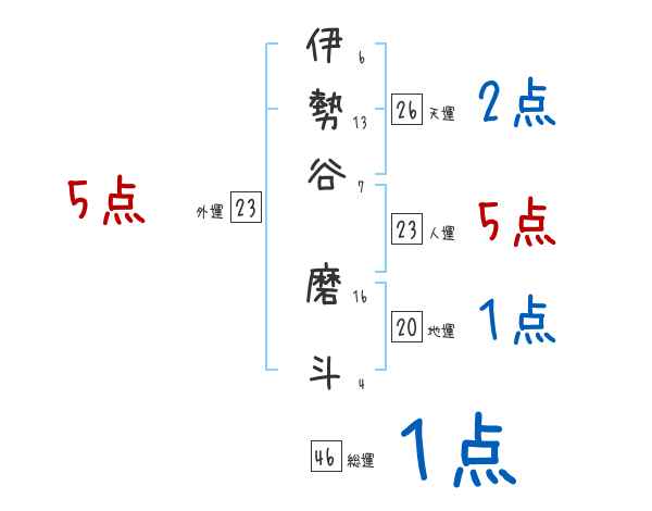 外運![]() | 伊勢谷磨斗さんの外運は23画の5つ星!想像力に優れ活力がある。一代で成功し名誉を手に入れる。 生活面を象徴する運勢です。外部から受ける影響力を表し、結婚運、家庭運や職場、環境への順応性を表します。 |