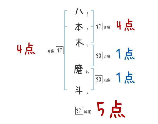 外運![]() | 八本木磨斗さんの外運は17画の4つ星!積極的な行動力。地位を気づき財産を手に入れる。純粋な心と直感力。 生活面を象徴する運勢です。外部から受ける影響力を表し、結婚運、家庭運や職場、環境への順応性を表します。 |