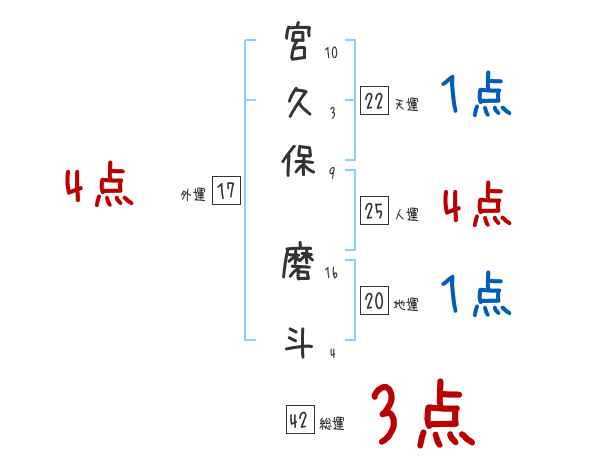 総運![]() | 宮久保磨斗さんの総運は42画の3つ星!病気に注意。多芸であるが消極的でおとなしい。 あなたの人生を表す1番重要な運勢です。生涯を通じて影響する総合運となり、主に50歳以降の晩年期に影響を及ぼします。 |