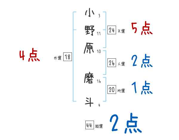 総運![]() | 小野原磨斗さんの総運は44画の2つ星!誠実で慎重な性格。物事を考えすぎないように注意しましょう。 あなたの人生を表す1番重要な運勢です。生涯を通じて影響する総合運となり、主に50歳以降の晩年期に影響を及ぼします。 |