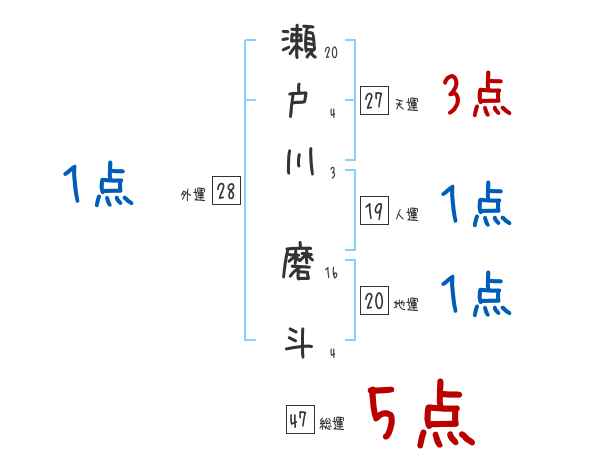 総運![]() | 瀬戸川磨斗さんの総運は47画の5つ星!実力が開花し発展する円満な人生。財に恵まれる。 あなたの人生を表す1番重要な運勢です。生涯を通じて影響する総合運となり、主に50歳以降の晩年期に影響を及ぼします。 |