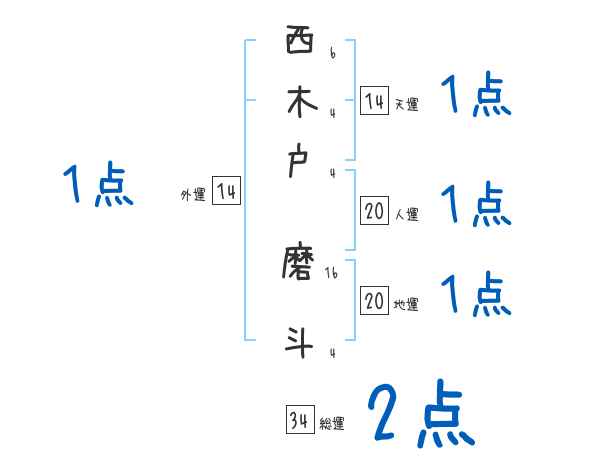 総運![]() | 西木戸磨斗さんの総運は34画の2つ星!独創性に優れるが、自尊心が強く災難に注意しましょう。 あなたの人生を表す1番重要な運勢です。生涯を通じて影響する総合運となり、主に50歳以降の晩年期に影響を及ぼします。 |
