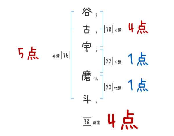 天運![]() | 谷古宇磨斗さんの天運は18画の4つ星!情熱的で剛気。忍耐力があり信頼される。 家系が持つ宿命的な運勢を表します。祖先から受け継いだ苗字ですので自分の力が及びません。家柄を象徴します。 |