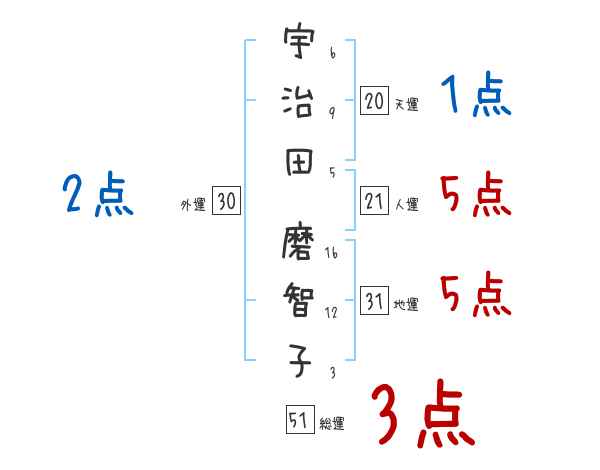 外運![]() | 宇治田磨智子さんの外運は30画の2つ星!浮き沈みの激しさに注意しましょう。 生活面を象徴する運勢です。外部から受ける影響力を表し、結婚運、家庭運や職場、環境への順応性を表します。 |