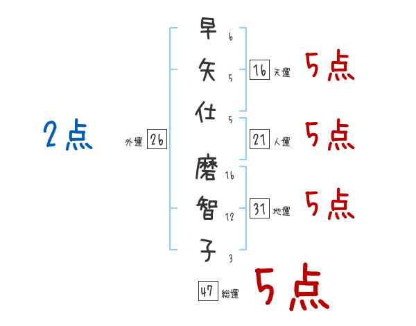 天運![]() | 早矢仕磨智子さんの天運は16画の5つ星!人望が厚く大きく発展する。逆転成功が見える。 家系が持つ宿命的な運勢を表します。祖先から受け継いだ苗字ですので自分の力が及びません。家柄を象徴します。 |