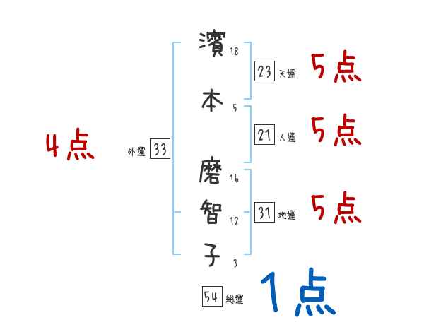 | 総運  | 濱本磨智子さんの総運は54画の1つ星!トラブルが多いかも。周りをよく見て協調して過ごしましょう。あなたの人生を表す1番重要な運勢です。生涯を通じて影響する総合運となり、主に50歳以降の晩年期に影響を及ぼします。 |