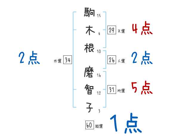 総運![]() | 駒木根磨智子さんの総運は60画の1つ星!悲観的で迷いやすい。波乱が多く損をしないように。 あなたの人生を表す1番重要な運勢です。生涯を通じて影響する総合運となり、主に50歳以降の晩年期に影響を及ぼします。 |