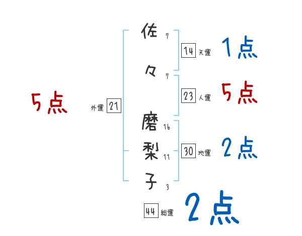 人運![]() | 佐々磨梨子さんの人運は23画の5つ星!想像力に優れ活力がある。一代で成功し名誉を手に入れる。 性格や才能などを表す2番目に重要な運勢です。人間関係や協調性、社会的な成功に影響します。主に20歳から50歳ぐらいまでの中年期の運勢を表します。 |