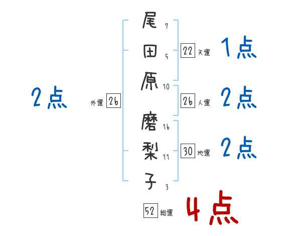 人運![]() | 尾田原磨梨子さんの人運は26画の2つ星!波瀾万丈かも。信頼できる人を大事にしましょう。 性格や才能などを表す2番目に重要な運勢です。人間関係や協調性、社会的な成功に影響します。主に20歳から50歳ぐらいまでの中年期の運勢を表します。 |