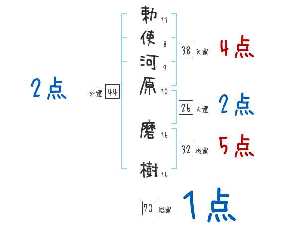 外運![]() | 勅使河原磨樹さんの外運は44画の2つ星!誠実で慎重な性格。物事を考えすぎないように注意しましょう。 生活面を象徴する運勢です。外部から受ける影響力を表し、結婚運、家庭運や職場、環境への順応性を表します。 |