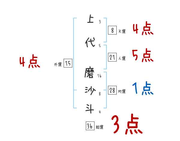 地運![]() | 上代磨沙斗さんの地運は28画の1つ星!家庭環境に注意。スポーツで活躍できる能力があるかも。 個性を表す基礎的な運勢です。性格形成や対人関係、行動力など家庭環境に影響されます。主に誕生してから20歳くらいまでの若年期の運勢を表します。 |
