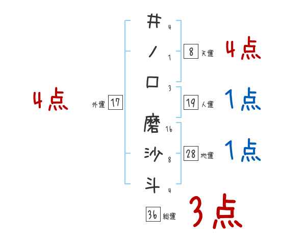 外運![]() | 井ノ口磨沙斗さんの外運は17画の4つ星!積極的な行動力。地位を気づき財産を手に入れる。純粋な心と直感力。 生活面を象徴する運勢です。外部から受ける影響力を表し、結婚運、家庭運や職場、環境への順応性を表します。 |