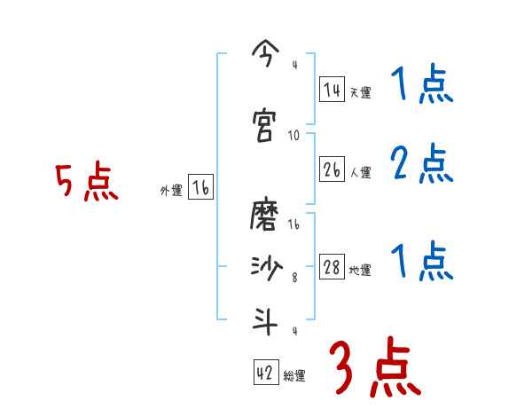 外運![]() | 今宮磨沙斗さんの外運は16画の5つ星!人望が厚く大きく発展する。逆転成功が見える。 生活面を象徴する運勢です。外部から受ける影響力を表し、結婚運、家庭運や職場、環境への順応性を表します。 |