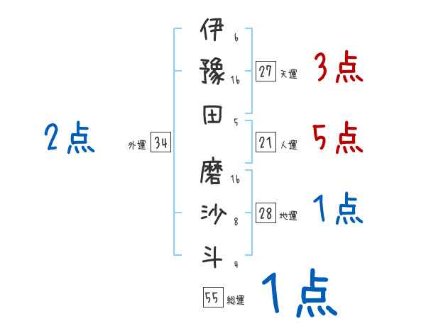 人運![]() | 伊豫田磨沙斗さんの人運は21画の5つ星!統率力がある。独立し成功する。名誉を手に入れる。 性格や才能などを表す2番目に重要な運勢です。人間関係や協調性、社会的な成功に影響します。主に20歳から50歳ぐらいまでの中年期の運勢を表します。 |