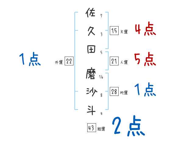 地運![]() | 佐久田磨沙斗さんの地運は28画の1つ星!家庭環境に注意。スポーツで活躍できる能力があるかも。 個性を表す基礎的な運勢です。性格形成や対人関係、行動力など家庭環境に影響されます。主に誕生してから20歳くらいまでの若年期の運勢を表します。 |